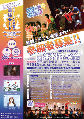 【参加対象】 ダンス、歌:小学1年生~高校3年生、フリースタイルフットボール:幼稚園年長~高校3年生